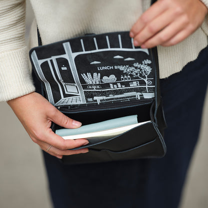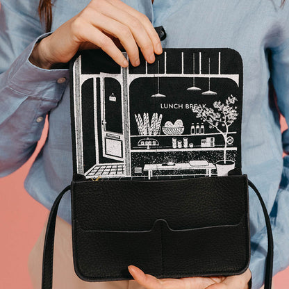 The Lunch Break is the perfect bag for your favourite moment of the day. It's a convenient Black women's bag, lunchbox size, featuring a print on the inside of that lovely lunch bar on the corner. Although it's compact, the...