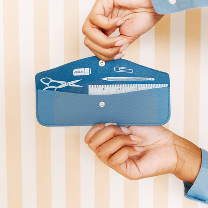 The Pen Pal is flat-stitched. It's just like a narrow envelope, so it fits snugly for example in your Lazy Boy crossbody bag. The pencil case is made of robust leather, so you can also use it to hold a small pair of scissors with sharp points. The leather comes from Italy and has been treated so that it will last for years and hardly requires any maintenance.